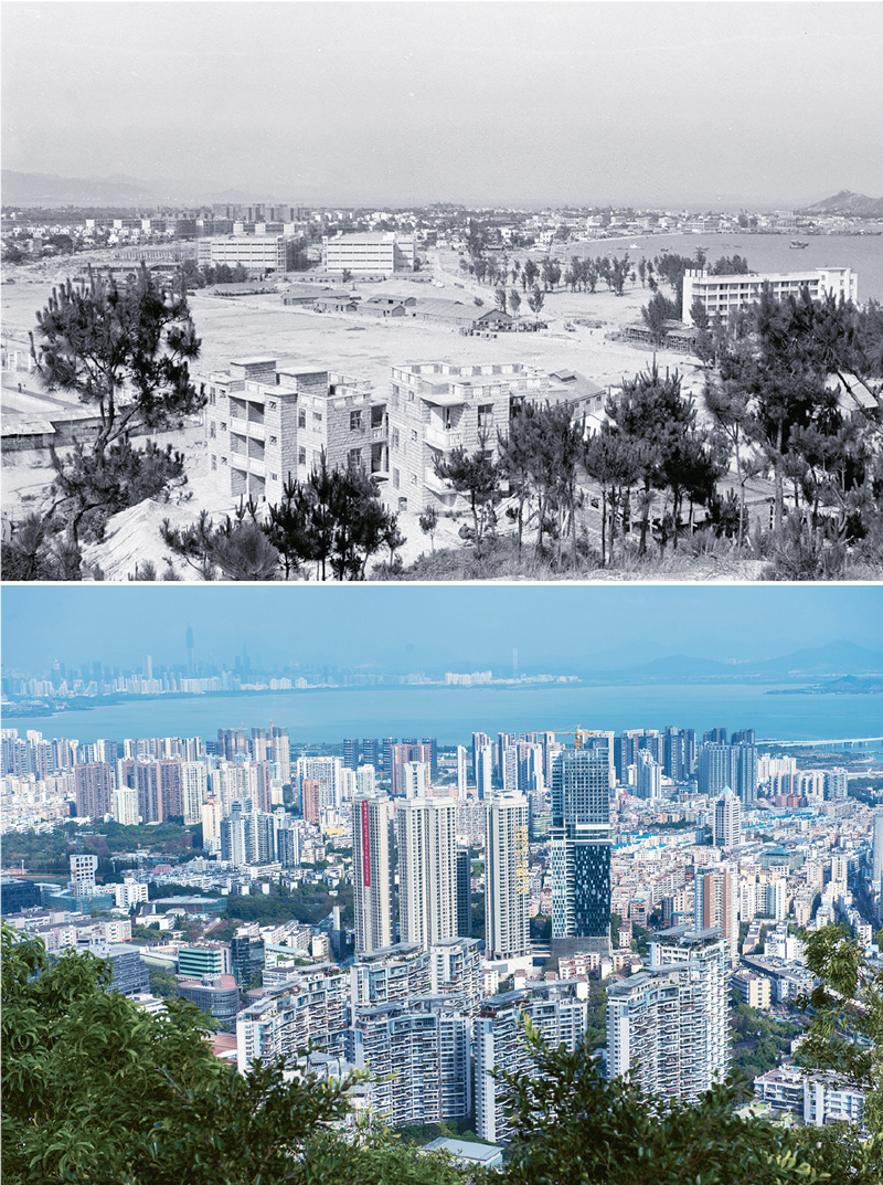 1978年12月,具有伟大转折意义的党的十一届三中全会,拉开了中国改革开放的时代大幕。改革开放40多年来,深圳从一个小渔村成长为国际性大都市,发生了翻天覆地的变化。图为拼版照片:上图为深圳蛇口工业区一瞥(1982年8月3日发,新华社记者李长永摄);下图为广东自贸区深圳前海蛇口片区内的蛇口片区(2015年2月26日,新华社记者毛思倩摄)。