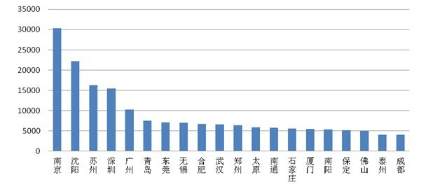 从2019年全国环保举报地理分布情况看,其与我国人口区域分布“黑河-腾冲线”重合度很高,举报高度集中在华北平原、华东平原、东南沿海、四川盆地等人口相对密集的区域。从地市一级看,举报量最多的20个地级市依次为南京、沈阳、苏州、深圳、广州、青岛、东莞、无锡、合肥、武汉、郑州、太原、南通、石家庄、厦门、南阳、保定、佛山、泰州、成都,其举报量之和占全国举报总量的34.3%。