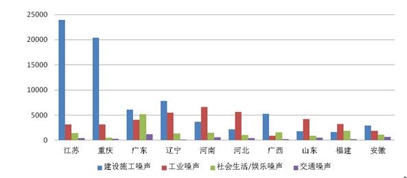 2019年全国噪声污染举报中,建设施工噪声为群众关注焦点,举报量占噪声举报的45.4%,其次为工业噪声,占26.5%。噪声污染举报数量前十的省(区、市)中,江苏、重庆建设施工噪声问题较为严重,分别占全国同类型举报的26.0%和22.2%;河南、河北、山东工业噪声问题相对突出。