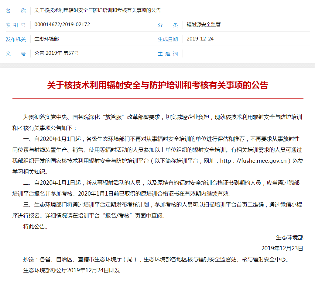 接生态环境部通知,自2020年1月1日起,各级生态环境部门不再对从事辐射安全培训的单位进行评估和推荐,不再要求从事放射性同位素与射线装置生产、销售、使用等辐射活动的人员参加原推荐单位组织的辐射安全培训。有相关培训需求的人员可通过生态环境部组织开发的国家核技术利用辐射安全与防护培训平台(以下简称培训平台,网址:http://fushe.mee.gov.cn)免费学习相关知识。公告原文如下: