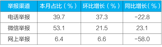 从各地区不同渠道举报数量看,广东、重庆、江苏、河南等地举报总量居前,重庆、上海等地电话举报占比较高,广东、浙江、江西、黑龙江等地微信举报占比较高。