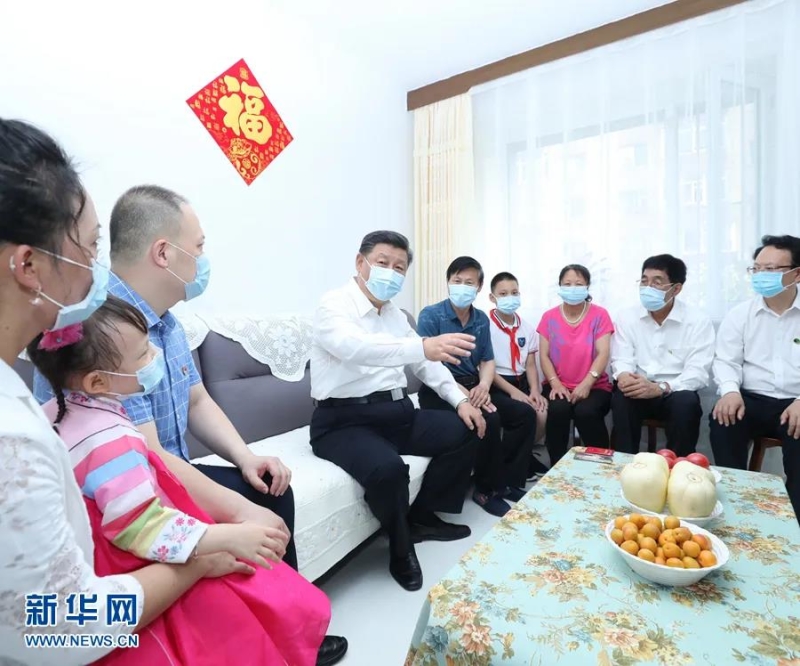 7月22日至24日,中共中央总书记、国家主席、中央军委主席习近平在吉林省考察。这是7月23日下午,习近平在长春市宽城区团山街道长山花园社区,同居民赵兴福一家唠家常。新华社记者 鞠鹏 摄
