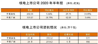 中国核电、中国广核近日发布的2020年半年报显示,两家公司营收和归母净利润均实现增长。中国核电、中国广核分别实现营收232.34亿、315.07亿元,分别同比增长5.66%、18.79%;归母净利润29.75亿、52.05亿元,分别同比增长14.49%、3.64%。