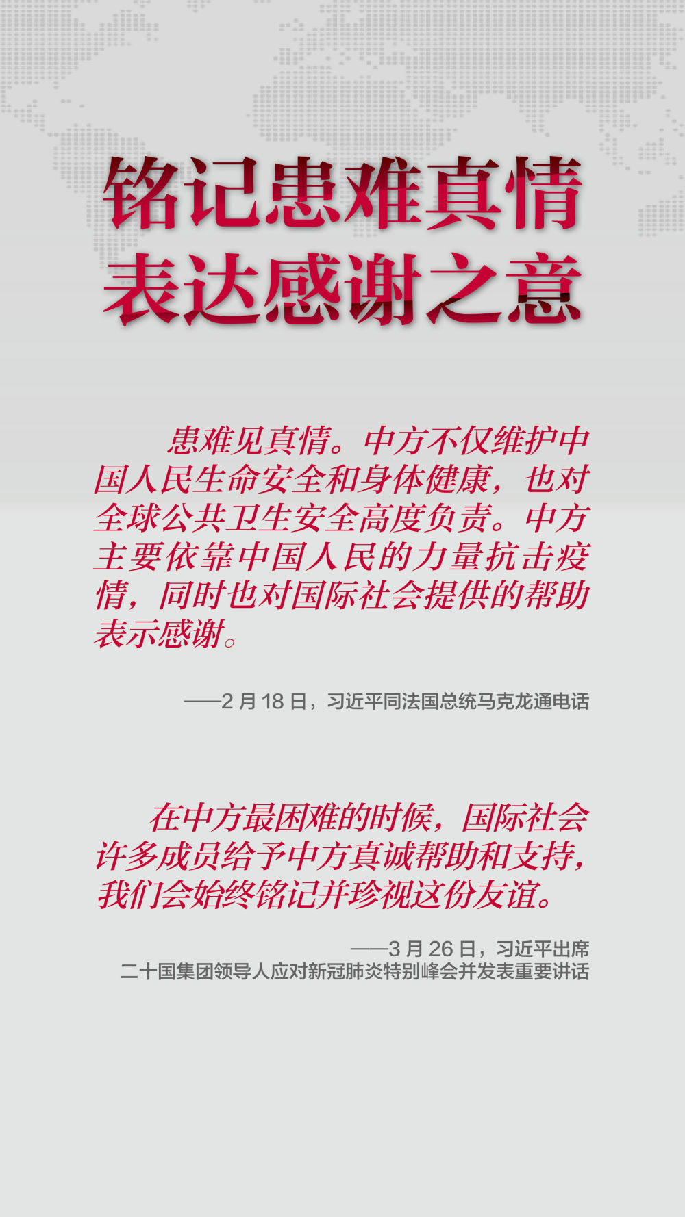 战“疫”以来,各国政要和国际组织负责人向习主席表达对中国抗击疫情举措的敬佩,对中国持续提供抗疫援助的感谢,对中国推动疫情防控国际合作的支持,对进一步深化友谊、扩大合作的积极意愿,以及对人类命运共同体理念的强烈共鸣。