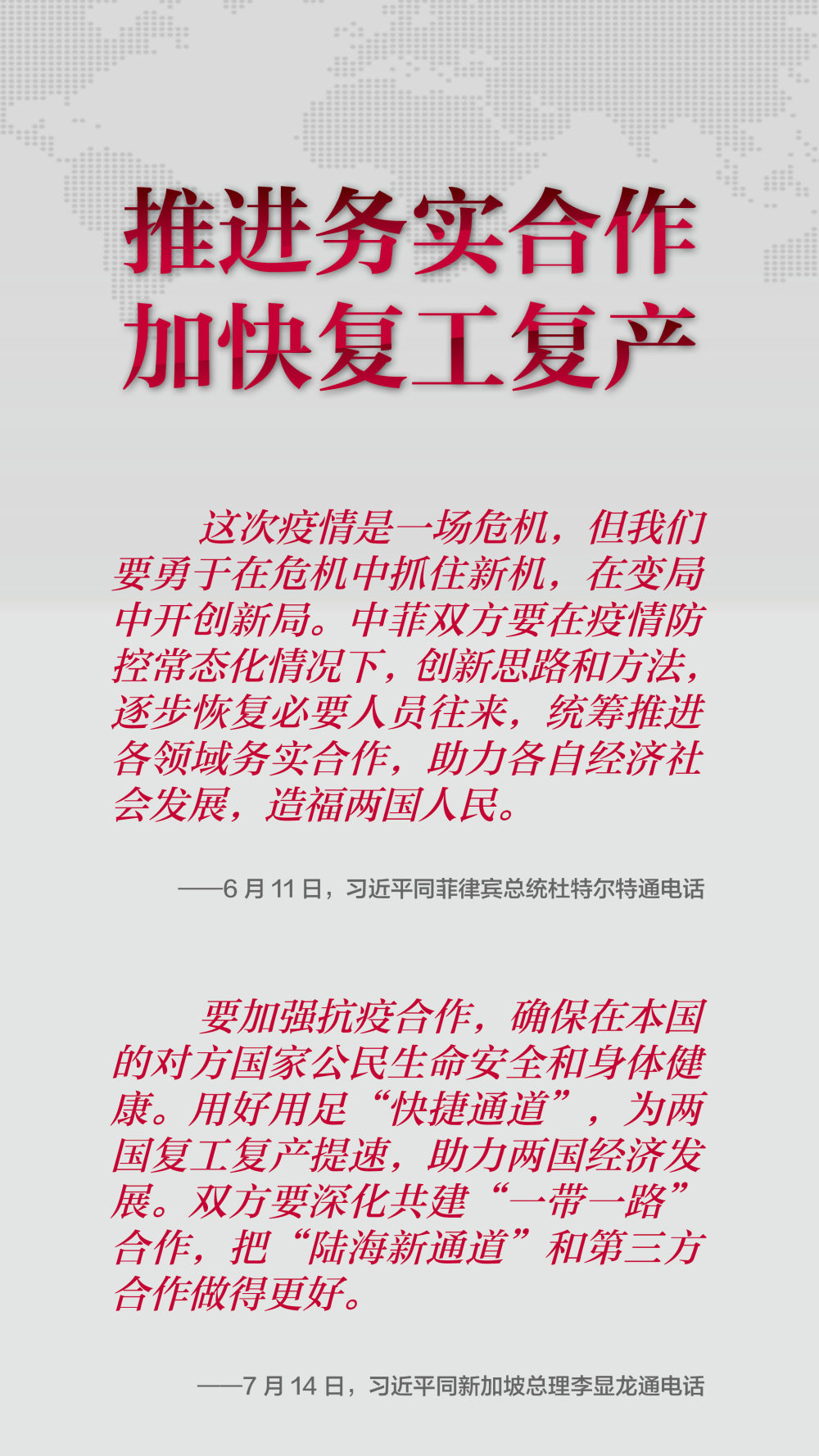 既有双边对话,也有多边会议;既有与来自亚、欧、非、北美、南美等大洲国家领导人互动,也有同国际组织负责人会见通话;既面向外国政要和国际组织,也面向外方友好人士和普通民众;既谈疫情防控,也谈传统友谊、务实合作、复工复产、“一带一路”、多边主义、全球治理等话题。