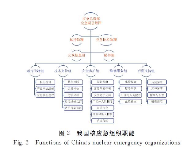 在国家级层面上,设立国家核事故应急协调委员会,由政府与军队的相关部门组成。并设立国家核事故应急办公室,对国家核事故应急协调委员会的日常工作活动负责。在省区市一级,设立核应急协调机构。核应急组织职能如图 2所示。