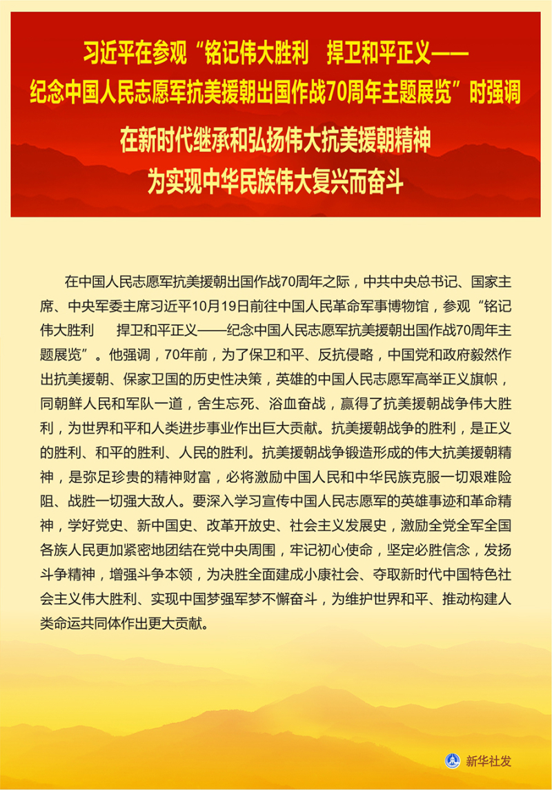 新华社北京10月19日电 在中国人民志愿军抗美援朝出国作战70周年之际,中共中央总书记、国家主席、中央军委主席习近平19日前往中国人民革命军事博物馆,参观“铭记伟大胜利 捍卫和平正义——纪念中国人民志愿军抗美援朝出国作战70周年主题展览”。他强调,70年前,为了保卫和平、反抗侵略,中国党和政府毅然作出抗美援朝、保家卫国的历史性决策,英雄的中国人民志愿军高举正义旗帜,同朝鲜人民和军队一道,舍生忘死、浴血奋战,赢得了抗美援朝战争伟大胜利,为世界和平和人类进步事业作出巨大贡献。抗美援朝战争的胜利,是正义的胜利、和平的胜利、人民的胜利。抗美援朝战争锻造形成的伟大抗美援朝精神,是弥足珍贵的精神财富,必将激励中国人民和中华民族克服一切艰难险阻、战胜一切强大敌人。要深入学习宣传中国人民志愿军的英雄事迹和革命精神,学好党史、新中国史、改革开放史、社会主义发展史,激励全党全军全国各族人民更加紧密地团结在党中央周围,牢记初心使命,坚定必胜信念,发扬斗争精神,增强斗争本领,为决胜全面建成小康社会、夺取新时代中国特色社会主义伟大胜利、实现中国梦强军梦不懈奋斗,为维护世界和平、推动构建人类命运共同体作出更大贡献。