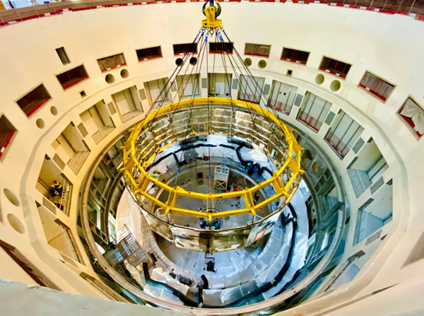当地时间1月14日,在法国南部卡达拉舍,国际热核聚变实验堆(ITER)托卡马克装置第三个重大部件——杜瓦下部冷屏成功落位至杜瓦底座内侧上方,吊装工作圆满完成。杜瓦下部冷屏吊装是ITER计划重大工程安装启动仪式后的第二个重大部件安装,也是中核集团中国核电工程有限公司牵头的中法联合体在法国完成的2021年第一个重大节点和重大安装任务,为ITER计划的顺利推进再次贡献中国智慧和中国力量,体现了中国恪守国际承诺的责任担当。