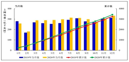 ▲图3 2019、2020年1-12月全国运行核电机组上网电量趋势