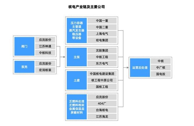 核电产业链核心环节包括:1)核电设备:上海电气、东方电气、江苏神通、中核科技;2)核燃料:中广核矿业;3)工程建设:中国核建等。