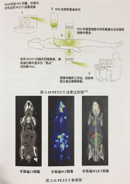 PET/CT(图2-9)是将PET和CT两个成像技术结合起米的融合成像设备,实现了PET和CT图像的同机融合(图2-10)。使PET的功能影像和螺旋CT解剖影像两种显像技术的优点融于一体,形成优势互补,一次成像即可获得PET图像,又能获得相应部位的CT图像,对病灶进行准确定位和定性,为医生提供更多的诊断信息。CT、PET以及 PET/CT成像的对比见图2-11。
