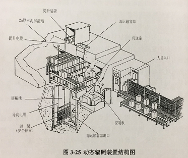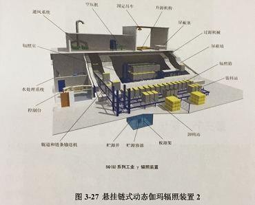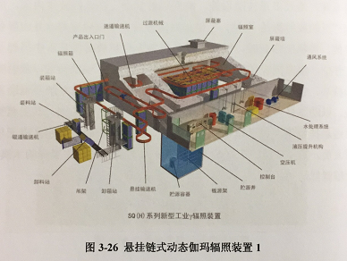 辐照加工是在辐照加工厂里进行的,其进行辐照加工的设施通常叫做辐照装置。辐照装置内部区域分控制区和监督区。控制区墙壁厚实,门禁严密,还设有迷道,确保射线无法穿出控制区。辐照加工时控制区内严禁有人员停留。监督区内主要有操作台和监视报警系统,通过多重技防设施,确保辐射安全。在辐照装置内部,应用广泛的放射源是的钻,的钻放射源被放置在辐照室的水井内屏蔽存放。当辐照作业时,操作人员通过控制台将放射源从水中吊起至工作位,辐照围绕在放射源周边的物品。常见γ辐照装置以放射源为核心,包括放射源升级系统、控制系统、产品传输系统等辅助系统。以动态悬挂链式辐照装置(图3-25~图3-27)为例,其受照物品由悬挂货箱经运送轨道送入辐照室,工作时辐照室控制区内无任何人员。其原理类似于挂炉烤鸭,其中放射源就是好比燃烧的木炭,货箱就似烤鸭。