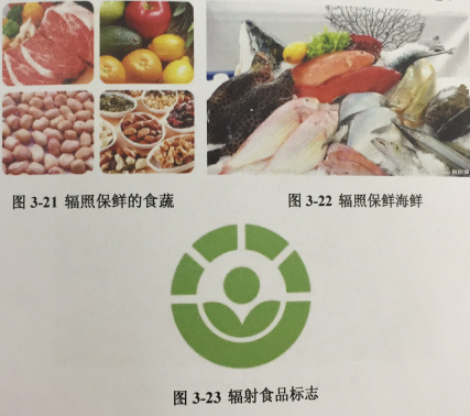 新捕捞的鱼虾,新屠宰的猪羊肉,经过清洗、装进包装袋、抽真空密封和射线辐照灭菌处理等环节后,人们食用时既方便卫生又新鲜可口(图3-22)。图3-23给出了经过辐照加工食品的标志。