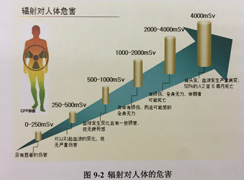 了解了辐射剂量概念,如果你想对应一下辐射剂量与健康效应的关系,请看图9-2,这里给出了人体一次受照后的辐射生物效应。不过,由此表也可以看出人体一次受到250毫希的照射不会发生实质上的身体损伤。