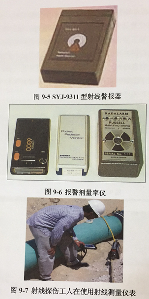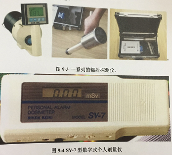 此外,特别说明一种辐射探測器-剂量报警仪(图9-5、图9-6)剂量报警仪可以在环境或人体所处位置的辐射剂量率超过设定值时报警,为人员提供保护,一般由从事編射相关工作的人员佩戴。工作人员现场使用辐射测量仪表,见图9-7。