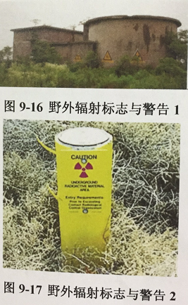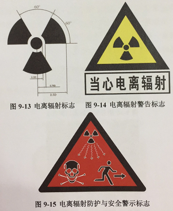 为保护公众,避免与减少不必要的辐射照射,人们设置了统一的电离辐射标志(图9-13)、电离辐射警告标志(图9-14)以及电离辐射防护与安全警示标志(图9-15)。其中,电离辐射标志、电离辐射警告标志在我国2002年颁布的《电离辐射防护与辐射源安全基本标准》(GB188871-2002)有具体的规定。