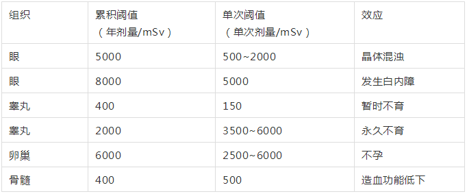 电离辐射由于会引起原子或分子发生电离效应,直接破坏了被辐射物体的物质结构,对人体的损害有着质的不同。电离辐射被人体吸收的部位会发生一定的变化。如果人体的器官组织因此受到损伤,会表现出各种“症状”,这些症状,术语上叫做“生物效应”。下面的表格给出了急性单次照射下确定相应的阈值和常年接触照射下确定相应的阈值,供大家了解。
