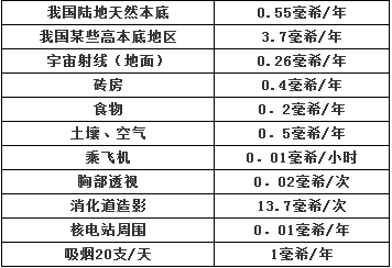 除天然放射性外,人工放射性也与我们的日常生活密不可分,人们受到的放射性照射大约有82%来自天然环境,大约有17%来自医疗照射,而来自其他活动大约只有1%。我们日常生活中受到辐射照射的情况列于下表: