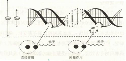 电离辐射在射入人体组织以后,通过直接或间接电离作用,使生物体内的分子产生电离或激发。当带电粒子直接射到生物大分子时,例如脱氧核糖核酸(DNA)和核糖核酸(RNA),可以使这些大分子发生变化,这种作用称为直接作用。当带电粒子与生物体人的水分子(H2O)作用时,水分子发生变化,产生各种自由基和活化分子,例如H+、OH-、H2O2、H2O+等。这些辐射后的分解产物再与生物大分子发生作用,使生物大分子发生改变或破坏,就是所谓的间接作用。一般认为,由于生物细胞中水占80%,间接作用远远大于直接作用,但生物大分子比水分子大的多,生物大分子直接受带电粒子轰击的概率也不会太低。间接作用的结果表明,加之分子间的能量转移,又会产生更多生物分子自由基。这些自由基又可与生物分子反应,使更多的分子发生变化。上述过程是由物理阶段的能吸收发展成为分子结构变化的物理化学过程。进而发展成为分子间变化的化学过程,最后由于生物代谢变化,导致细胞乃至肌体的损伤甚至死亡。图2-1概括了辐射对肌体的作用过程。