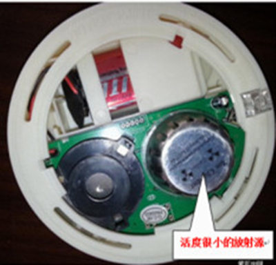烟雾报警器(图1、图2)具体原理是,内有一个电离室,电离室内置一枚活度极小能放出α粒子的镅-241放射源(活度约0.8微居里),正常状态下处于电场的平衡状态。