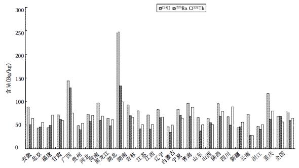 图1 全国各省煤中天然放射性核素含量分布