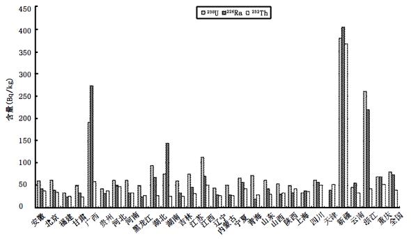 图1 全国各省煤中天然放射性核素含量分布