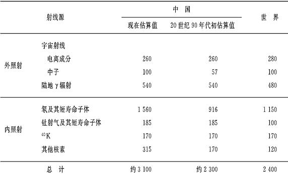 联合国原子辐射影响委员会(UNSCEAR)对天然辐射源的照射进行着持续的评估,并定期向联合国大会报告。给出了各种天然辐射成分引起的正常照射范围,世界公众的年平均有效剂量的范围一般预期在1~10mSv之间,估计的中值是2.4mSv(见UNSCEAR 2000年向联合国大会提交的报告及科学附件)。我国也对天然辐射进行了评估(见潘自强等编著:《中国辐射水平》[1]),估算的中值约为3.1 mSv。