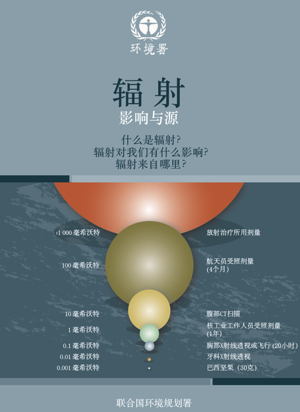 在正文开始之前,需要区分什么是电离辐射,什么是非电离辐射。电离辐射有足够的能量使原子释放电子,从而使原子带有电荷。而非电离辐射如无线电波、可见光或紫外辐射则非如此。本文介绍的是来自天然源和人工源的辐射照射影响,文中提到的术语“辐射”仅指电离辐射。