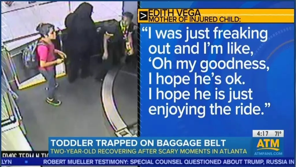 最终,当行李间的工作人员发现了传送带上的这个小朋友时,一群人扑上去救他,他才只好“依依不舍地”结束了长达5分钟的“行李传送带过山车之旅”。 有兴趣的同学可以看一下全程监控录像的剪辑版本。 估计很多中国家长遇到这个事情最大的担心是孩子被辐射了,会不会有后遗症,会不会致癌,然后自责痛哭自己是个非常不负责任的家长,内疚的要死...... 而这位美国妈妈虽然一下也吓蒙了,但接下去的反应则是“我希望他喜欢这次旅行”。