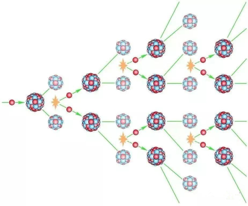 只有一些质量数非常大的原子核才能发生核裂变。这些原子的原子核在吸收一个中子以后会分裂成两个或更多个质量较小的原子核,同时放出两到三个中子,释放出的中子又能使别的重原子核接着发生核裂变……,这个过程称作链式裂变反应。