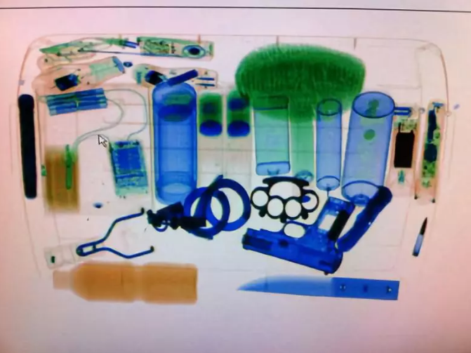 同样,对于安检机,X射线在不同物体上的穿透率不一样。当行李箱通过安检机的时候,X射线穿透行李箱,就会在显示屏上显示出不同物体的轮廓,然后再根据颜色的不同,就能进一步判断物体大概属于哪一类。
