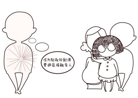 出于诊断或治疗的目的注射或摄入放射性药物的病人一定要意识到自己的体内已经有了放射性核素,自己相当于一个小小的放射源或辐射体,应该自觉地远离他人,尤其是远离孕妇以及3岁以下的小孩子。出于辐射安全的考虑,病人的活动区域以及出院时间是受到严格控制的,应在专用候诊室候诊,只有当其体内的放射性药物活度降至一定水平后才能出院。