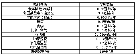 在我们的日常生活中,人们受到的放射性照射大约有82%来自天然环境,大约有17%来自医疗照射,而来自其他活动大约只有1%。我们日常生活中受到辐射照射的常见情况列于下表:
