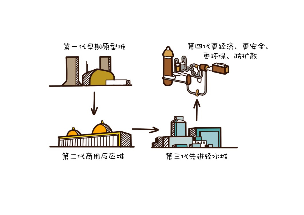 1942年12月,在美国芝加哥大学建成的世界第一座反应堆验证了可控的核裂变链式反应的科学可行性。至今,虽然世界上没有形成统一的划分标准,一般来讲世界核能系统的发展可以粗略地划为下述四代。