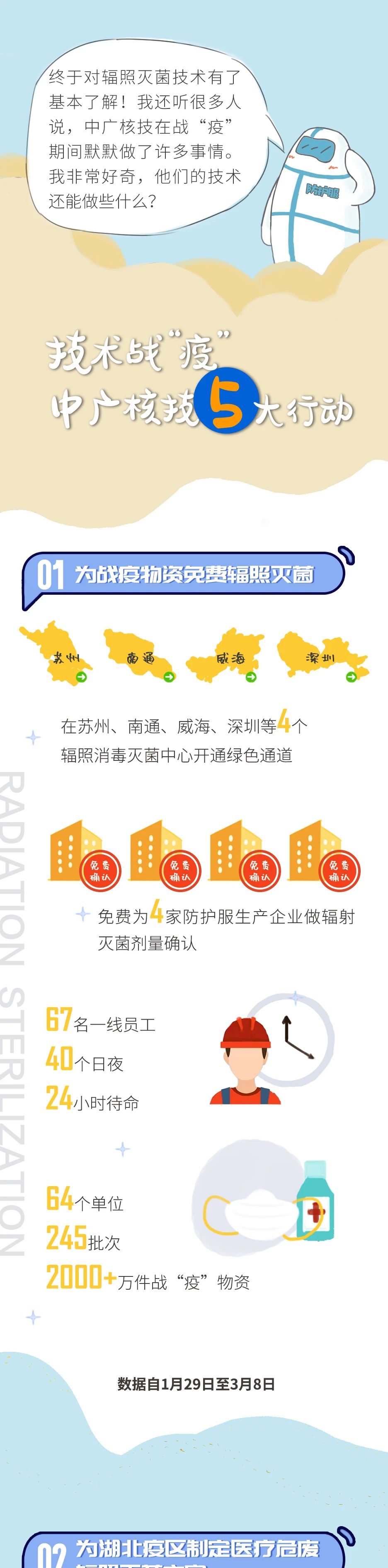 截至3月8日,中广核核技术发展股份有限公司(简称“中广核技”)为战“疫”医疗物资免费电子束辐照灭菌服务达245批,突破2000万件!