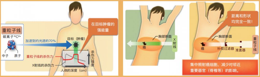 科学家们发现重离子的物理学特征是,重离子束进入身体后不会大量释放能量,只有在重离子停下来的位置才会释放其大部分能量,形成一个尖锐的能量峰(布拉格峰)。
