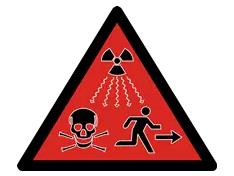这是2007年2月15日,国际原子能机构(IAEA)和国际标准化组织(ISO)联合宣布通过的一种新的电离辐射警告标志,其正式名称为“电离辐射防护与安全警示标志”。在红色的背景上,黑色的三叶草标志发出辐射,伴着一个黑色的骷髅,和一个指向远离危险方向的箭头。其中三叶草标志表示电离辐射,而红色的背景和骷髅警告危险。相对于出现在外包装、集装箱、工作场所出入口的经典标志,这个标志专用于那些可能会致人死亡或是造成人身伤害的放射源,只出现在设备内部,靠近危险放射源的地方,如果有人试图拆卸设备,标志将警告他们不要继续进行下去。