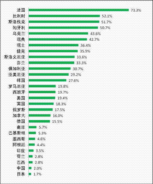 根据IAEA统计数据,2013年全球核能发电量总计23589亿千瓦时,比2012年增加129亿千瓦时。2013年核电国家中核能发电比例占10%以上的有20个,包括美、法等发达国家,其中法国核电比例最高,为73.3%,美国为19.4%,俄罗斯为17.5%,英国为18.3%,韩国为27.6%(图5)。