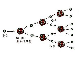 中子由于不带电,所以比带电粒子更容易进入原子核,干扰原子核的稳定。有的诱发裂变反应后会产生更多的中子,例如用中子轰击铀-235原子核,原子核分裂为较轻的原子核,同时产生2~3个中子,这些中子继续轰击其它铀-235原子核,会产生更多的中子。使反应继续下去,这个过程被人们称为“链式反应”。裂变不断进行,而且次数以非常快的速度增加,反应产生的能量也迅速地释放,当快到一定程度的时候就会发生爆炸。