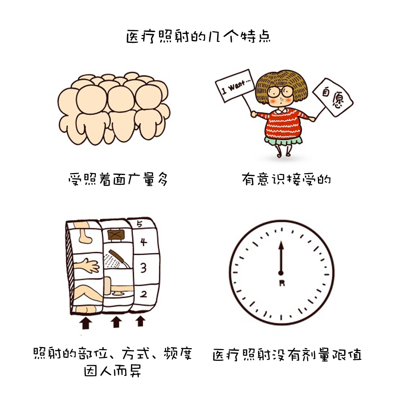 医疗照射的特点有:受照者人数众多;患者或受检查者的照射通常是必需的,接受照射是可以受益的;医疗受照的个体差异较大,大多数医疗照射是局部,照射方式、部位、频度等因人而异;医疗照射以诊断或治疗为目的,因此,受照剂量的大小要服从医疗上的需要,与职业照射和公众照射的管理方式不同,没有剂量限值。