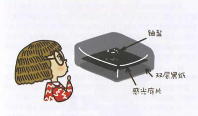 1896年,法国科学家贝克勒尔对刚发现不久的X射线很感兴趣。为了找出X射线和发出射线的铀盐之间的关系,贝克勒尔设计了一个实验:他将感光的底片包裹在黑纸中,再将铀盐矿石置于黑纸上面,然后把它们一起拿到太阳下曝晒。贝克勒尔对冲洗出来的底片进行观察,发现底片上有许多雾状细斑点,这说明铀盐矿石所发出的射线能穿透纸张。贝克勒尔再将黑纸换成薄的铝箔片及铜箔片,发现也能使底片曝光。