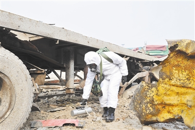 专家在天津8·12事故现场检查是否存在放射性物质。