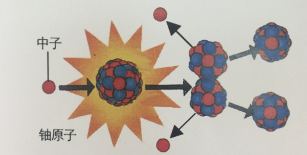 核裂变过程:重金属元素铀-235的原子核吸收一个中子后产生核反应,使这个重原子核分裂成两个(极少情况下会是3个)更轻的原子核以及2-3个自由中子,还有β和γ射线和中微子,并释放出巨大的能量。