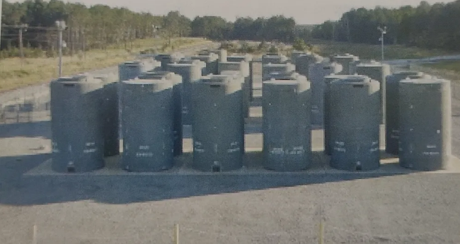 湿式贮存就是采用水池贮存,如本文开篇图片所示。湿式贮存发展较早,技术相对成熟,具有冷却能力高、密集贮存和易于操作等特点。干式贮存是通过干式贮存容器或设施来贮存乏燃料,如下图所示。干式贮存具有很大的灵活性、扩展性和多样性。干式贮存设施主要包括混凝土容器和金属容器等。