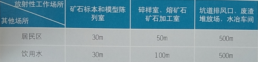 根据《铀矿地质勘查辐射防护和环境保护规定》(GB 15848-2009),居民区和饮用水源与铀矿地质工作场所的距离如表所示。