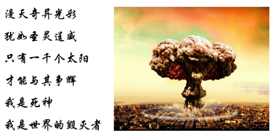 当现场目击第一颗原子弹试爆成功所展现的世界末日般情景时,科学家们体验到的绝不仅仅是成功的喜悦,更有着对于其未来前景的难以抑制的恐惧和担忧,因为他们清楚,这个孽障一旦被他们从潘多拉魔盒中亲手“释放”出来,其对于人类生命价值的肆虐和威胁,就不再为他们所能控制掌握了。奥本海默本“对自己所完成的工作有点惊惶失措”,而在心中浮起了“我成了死神,世界的毁灭者”的内疚感。