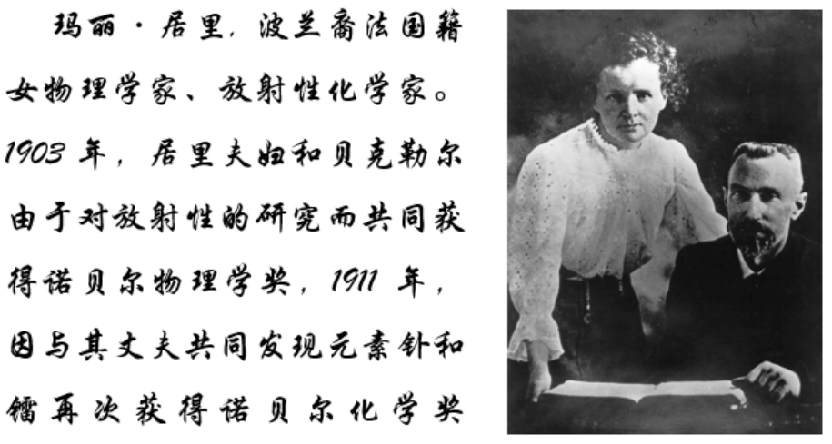 同现在大多数进入实验室的研究生一样,玛丽·居里一开始找不到课题可做。正好此时的贝克勒尔发现铀盐有穿透力。这引起居里夫妇的极大兴趣,居里夫人决心研究这一不寻常现象的实质。当他们从沥青矿石中提炼铀的时候意外地发现沥青铀矿的放射性比纯粹的氧化铀强四倍多。她断定,铀矿石除了铀之外,显然还含有放射性更强的元素,后来证实铀矿石中含有放射性更强的元素—镭。