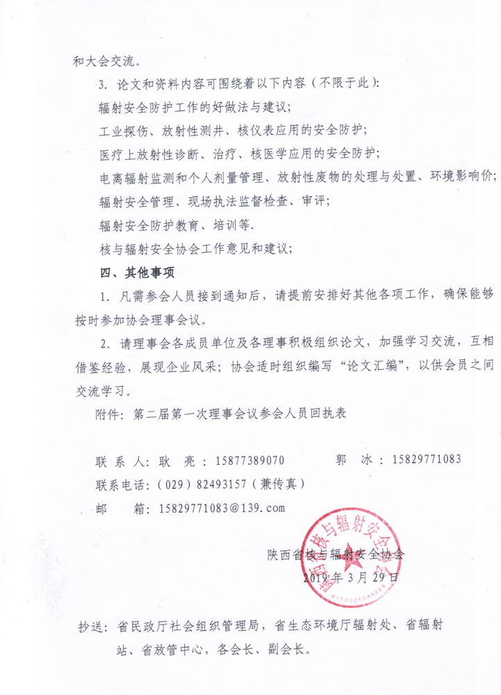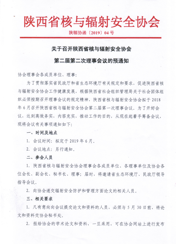 关于召开陕西省核与辐射安全协会第二届第二次理事会议的预通知