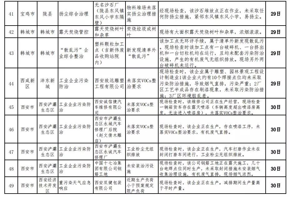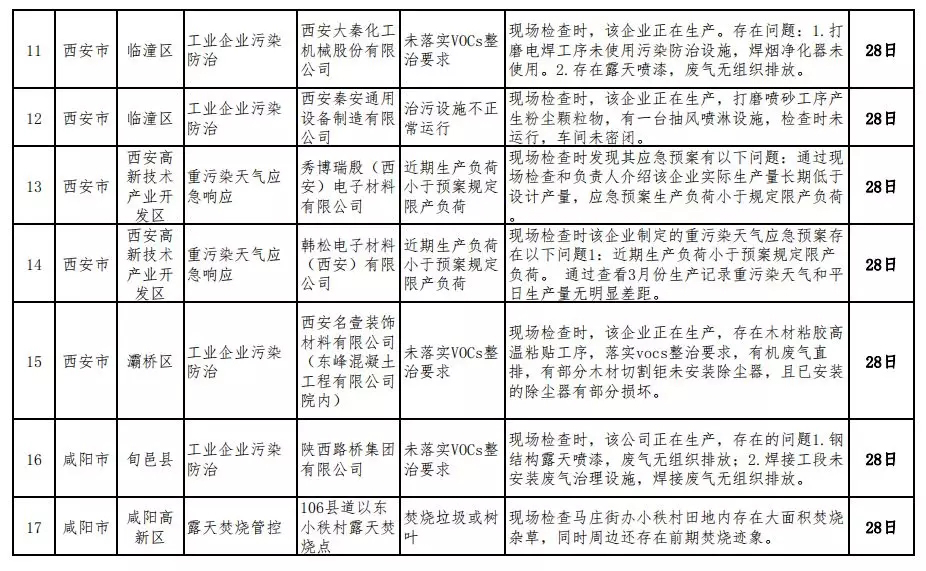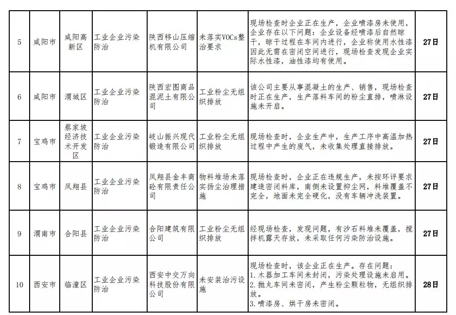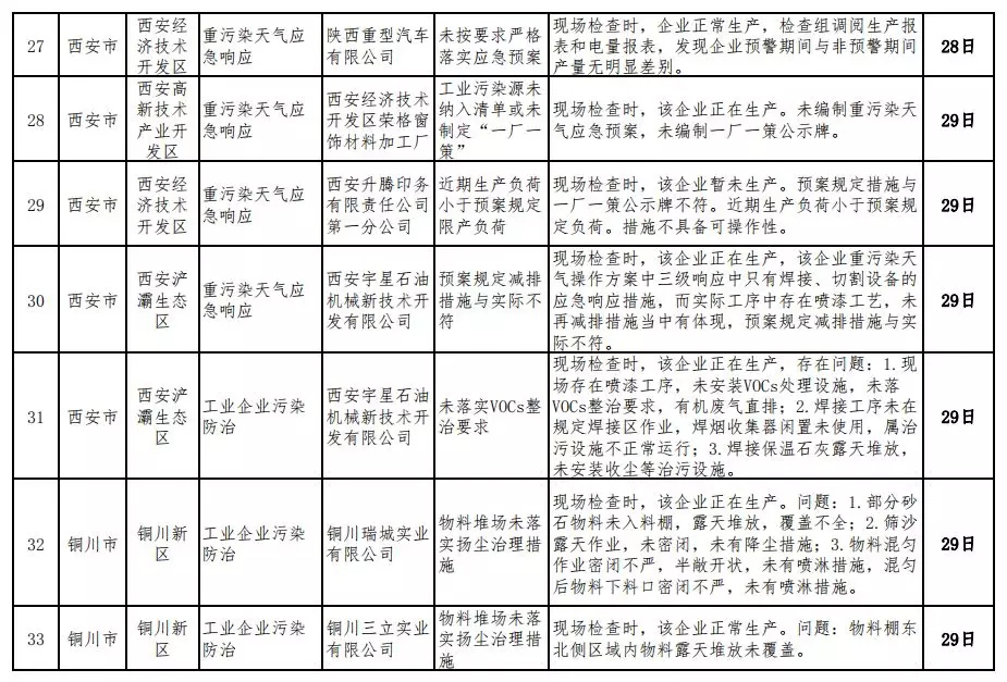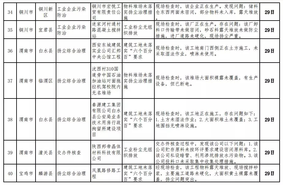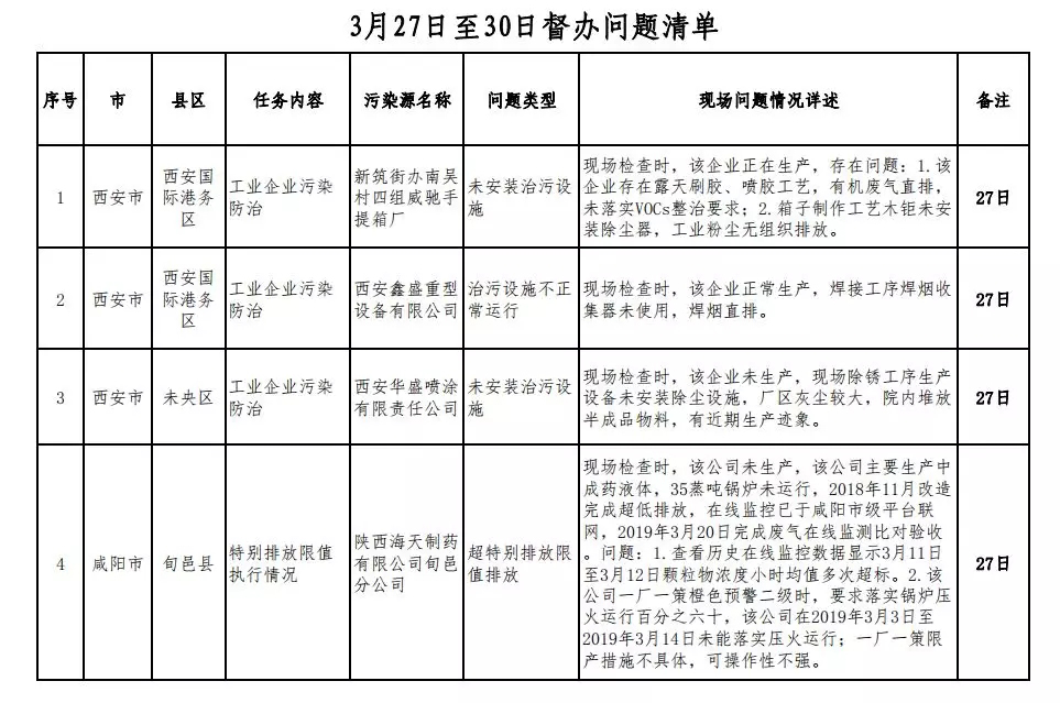 2019年3月27-30日,2018-2019年蓝天保卫战重点区域强化督查继续开展,按照工作方案要求,督查组对陕西省关中地区的县(市、区)进行督查,共检查点位781个,发现问题133个,转交我省督办70个(见附件)。