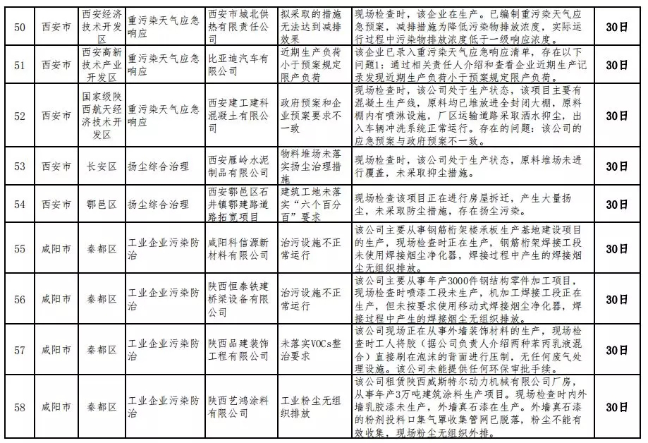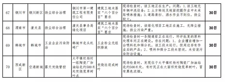督办的70个环境问题,西安市24个、宝鸡市11个、咸阳市14个、铜川市7个、渭南市9个、韩城市3个、西咸新区2个,杨凌示范区无督办问题。